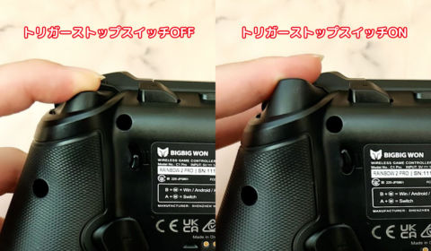 背面のM1/M2ボタンからすぐ上にある「トリガーストップスイッチ」は、RT/RTのトリガーボタンのストロークを短くするようロックをかけることができます。